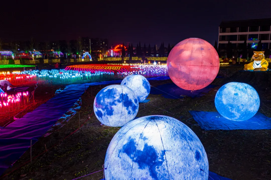 中国人过春节讲究阖家欢乐、热闹喜庆,辞别过去一年的辛劳,分享丰收的喜悦,传递美好的祝福。幻灯展占地10万平方米,分十六个展区,十万多颗田园风格盏灯,将一派元宇宙主题、田野风光元素通过梦幻灯光的方式完美再现。